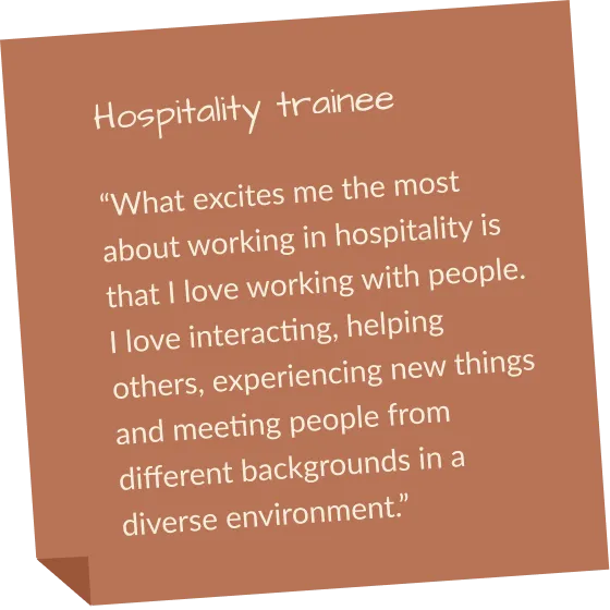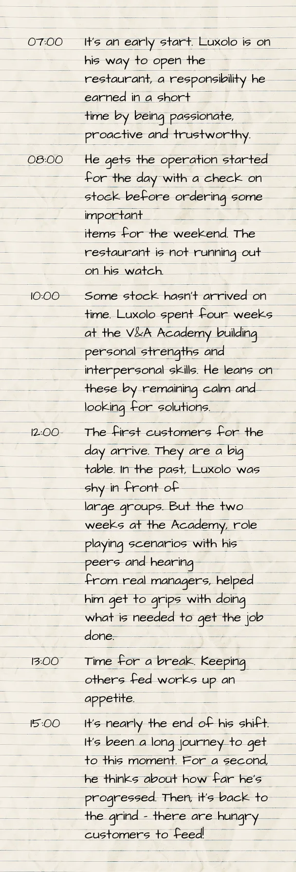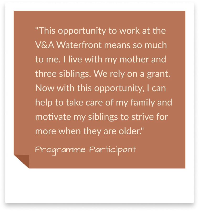 I work at the Time Out Market. Thanks to the V&A Academy training, job experience and placement support, I’ve kickstarted my career in the service industry. Now, I have the confidence and skills needed to chase my dreams. Watch this space!