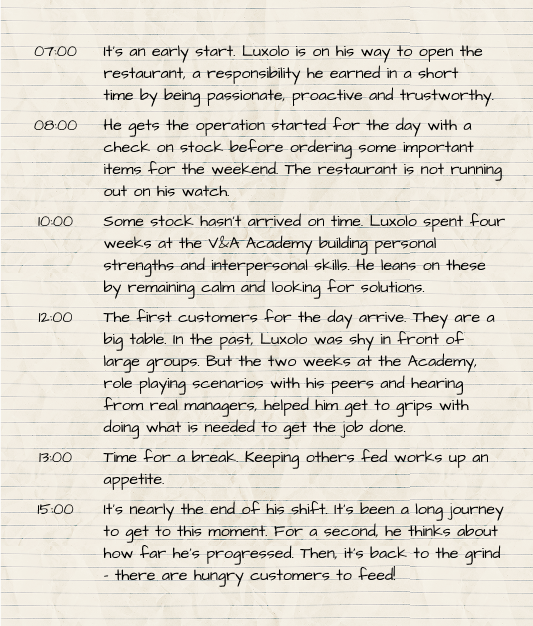As a vibrant, beating neighbourhood of living, work and play, the many tenants in our waterfront world are always on the lookout for reliable staff. As an organisation committed to driving economic impact for communities, we know that this is an opportunity for us to make a difference. That’s why we’ve launched the V&A Academy, which is aimed at empowering young people for careers in Hospitality, Tourism and Retail.