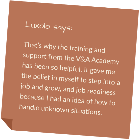 “We’re incredibly proud of Luxolo’s journey, from unemployed, to server, to stock supervisor, thanks to a little training, and a lot of dedication, and tenacity on Luxolo’s part. We’re excited to see more and more young people supported by the V&A Academy and our incredible tenants in the neighbourhood on similar journeys towards becoming economically independent.”