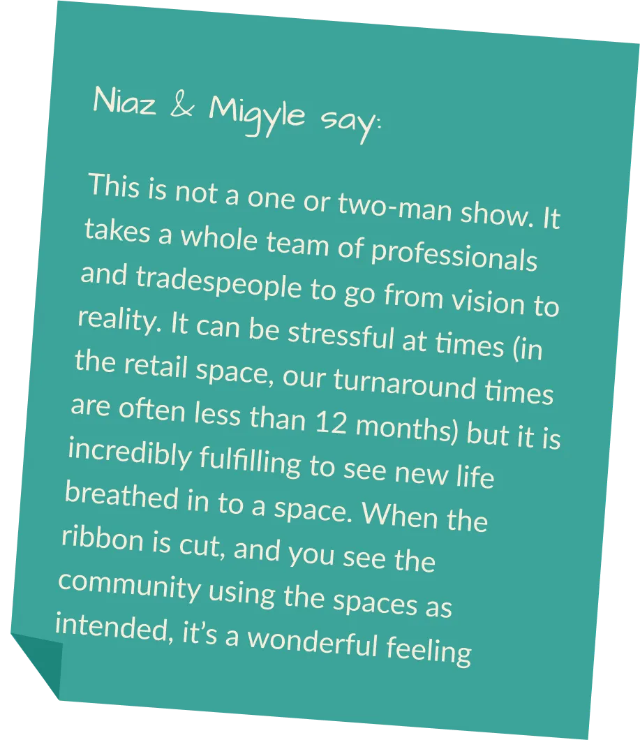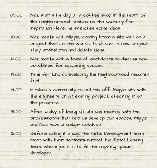 Our team of retail developers, led by Niaz and supported by Migyle, are expert at building the ideal spaces for modern retailers, while still celebrating the heritage that is deeply rooted in our neighbourhood. Explore how they create welcoming spaces that are sustainably minded and focused on enabling opportunity for all.